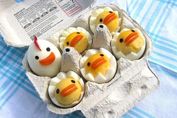 Una vez hervidos los huevos los dejamos enfriar y los pelamos con mucho cuidado. Vamos cortando la parte de arriba en zig-zag para que parezca que los huevos estén rotos, hemos de ir muy despacio para no romper la yema. Hacemos tiras con la zanahoria y la utilizamos para hacer el pico de los pollitos. Con aceitunas negras hacemos los ojos. Podemos hacer un pollito entero con la cresta, para ello utilizaremos un poco de pimiento.